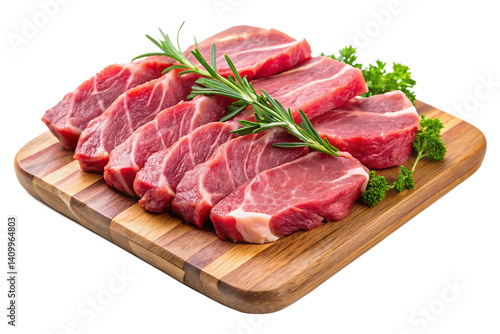 raw sliced meat on wooden cutting board isolated on white background PNG.AI GENERATED