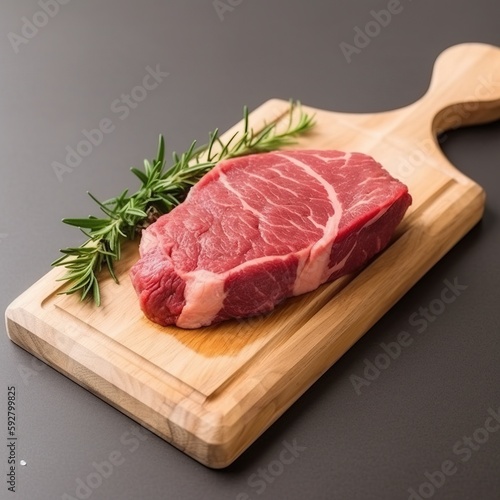 Raw steak on wooden board. Generative AI