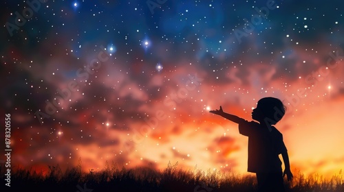 Reaching for the Stars - Silhouette of a Child Dreaming and Wishing at Night