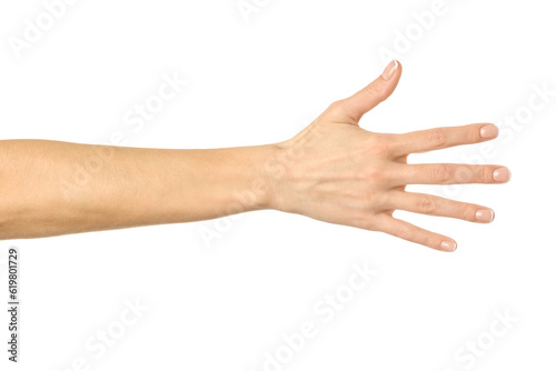 Reaching hand. Woman hand gesturing isolated on white