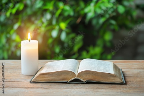 Reading an open book with a candle cozy corner natural light intimate setting tranquility and reflection