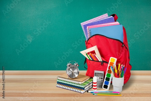 Ready for school background with books, accessory and bagpack
