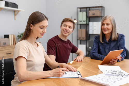 Real estate agent and couple doing paperwork at table in office, selective focus