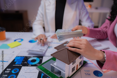 Real estate agent showing house model to client holding money during financial meeting with charts and calculator on table, discussing housing investment and mortgage contract