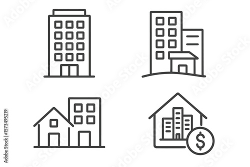 Real Estate and Office Building Line Icons Set. Modern Apartment, House, Skyscraper, Property Investment, Mortgage, Urban Architecture, Commercial and Residential Vector Illustration