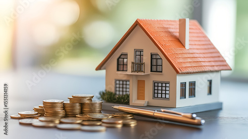 Real estate investment concept house plan with coins and pens, or signing a house purchase contract