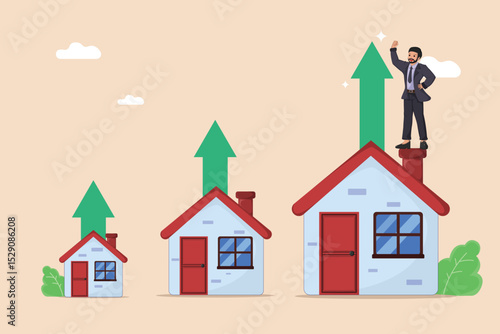 Real Estate Market Growth and Property Value Appreciation: A Conceptual Illustration Showing Houses of Increasing Size with Upward Arrows, Symbolizing Successful Investment and a Rising Market.
