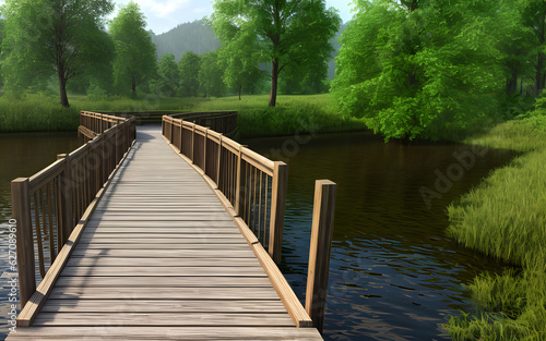 Realistic 3d environment of illustration wooden bridge in the nature for background