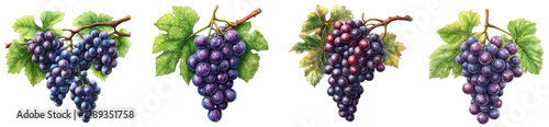 Realistic bunches of grapes with green leaves showcasing various grape varieties