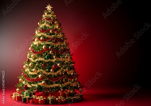 Realistic Christmas Tree with Golden Ornaments on Red Gradient Background