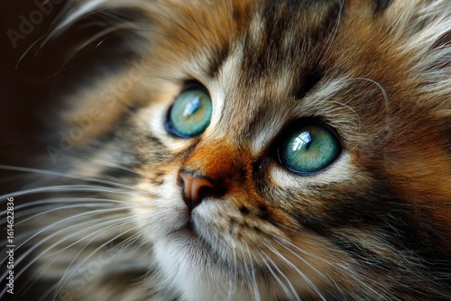 Realistic depiction of a cute cat with striking blue eyes in a calm indoor setting, showcasing intricate fur patterns and curious expression