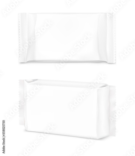Realistic flow pack mockup. Front and perspective view. Vector illustration isolated on white background. Easy to use for presentation your product, idea, design. EPS10.