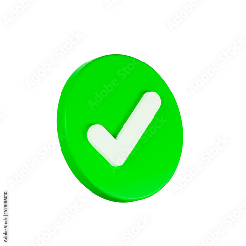 Realistic green checkmark button, symbol sign, Suitable for applications, cartography, GPS navigation, announcement banner, websites, front view, 3d rendering, illustration.