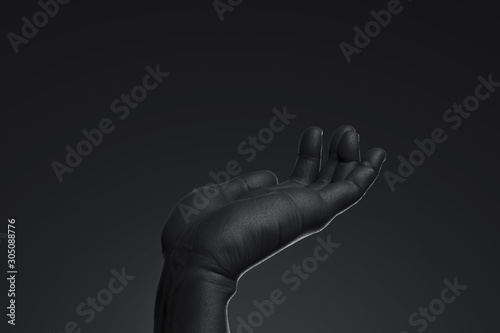 Realistic human hand with empty space as showcase isolated on black background. 3d rendering. Minimalism