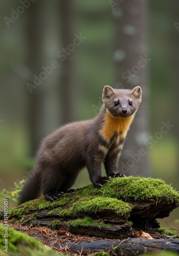 Realistic Image of Focused Marten Stood on Mossy Branch Amidst Forest
