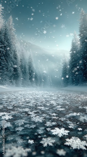 Realistic macro photo of snowflakes with crystalline patterns on soft blue blurred frozen forest background in sharp photorealistic detail.