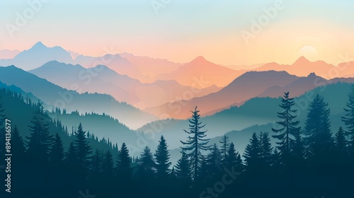 Realistic mountains landscape. Morning wood panorama, pine trees and mountains silhouettes. Vector forest hiking background.