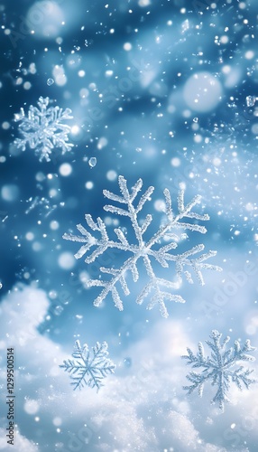 Realistic snowflakes falling gracefully against a bright blue sky background