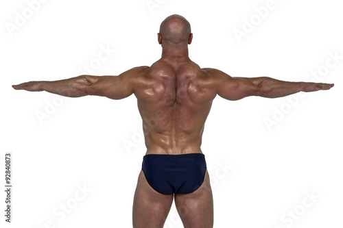 Rear view of muscular man exercising with hands