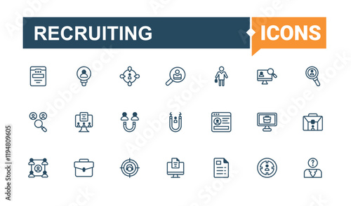 Recruiting icon pack. Containing on, job, human, business, Headhunting, skill, training and more. Flat UI icon design. Vector outline and solid icons collection.