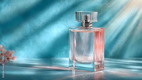 Rectangular perfume bottle on a teal background.