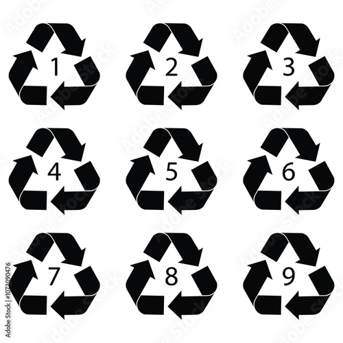 Recycling symbol. Recycling icon set. The number in the triangle indicates the type of plastic. Numbers set in recycling symbols. Vector illustration.