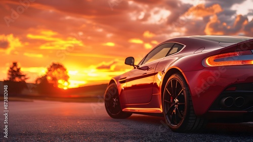 Red and black car parked on asphalt outdoor parking lot in the evening time with sunlight of sunset and beautiful orange sky background.
