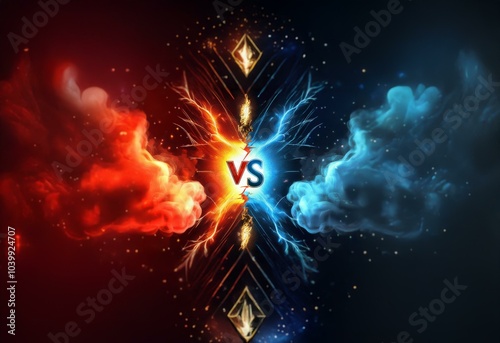 Red and blue abstract smoke bursts with sparks and energy, "VS" in the center.