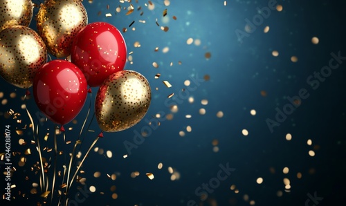 Red and gold foil balloons. Festive balloon composition with sparkling glitter on dark blue background. Birthday party decoration elements.