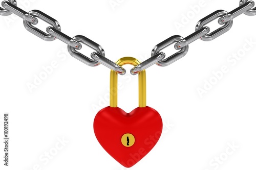 Red and Gold Heart Shaped Padlock Hanging from Steel Chains