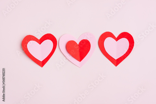 Red and Pink Paper Hearts on pink background, Heart shape papercut , Happy Valentine's day