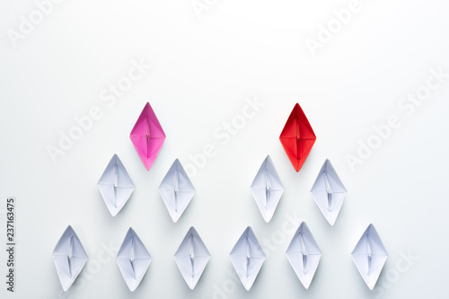 Red and pink paper ship leading among white. Equality or Competition for leadership between men and women concept.