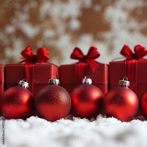 Red and white Christmas ornaments and gifts on snow