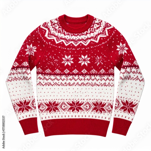Red and White Christmas Sweater with Snowflake Patterns on Isolated Background