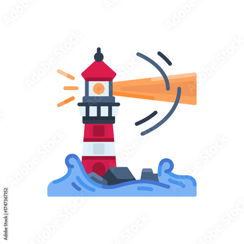 Red And White Striped Lighthouse Emitting Orange Light Beam Across Blue Water And Rocks On A Transparent Background