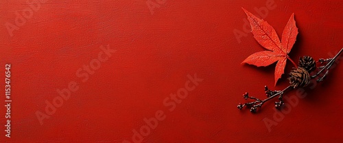 Red autumn leaf, pine cone, and berries on red background.