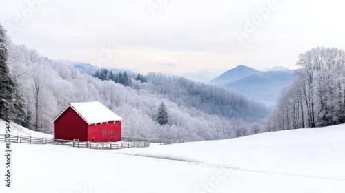 Red Barn Snowy Landscape, Winter Trees, Fence, Pristine, High-resolution Sharp Focus, Wide Angle Panoramic, Rural Serenity, Frosty Mountain Background, Cold White Palette, Ideal for Winter Calendar