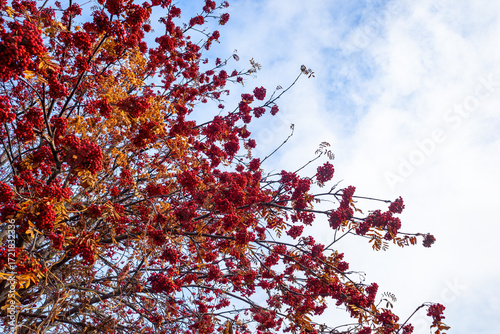 red berries, vibrant and sky blue is the rowan tree, a beautiful show with autumn on display in the sky.