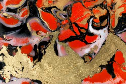 Red, black, white and gold paint liquid background. Abstract marble texture.