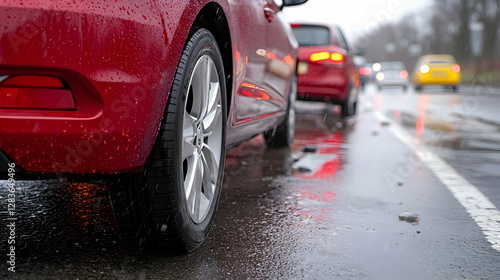 Red car stopped in rain, traffic jam, wet road