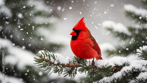 Red cardinal on a snow-covered branch with Christmas decorations and a wintery holiday atmosphere