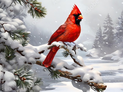 Red cardinal perched on a snow-covered pine branch, standing out vividly against a snowy winter landscape.
