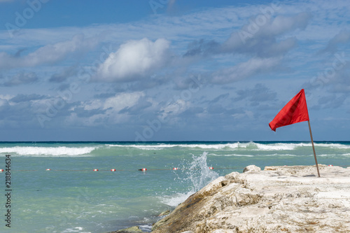 Red Caution Flag on ocean rock by the beach due to high tides, in Montego Bay, Jamaica
