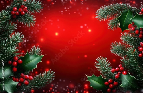 Red Christmas Background with Fir Branches and Holly Berries