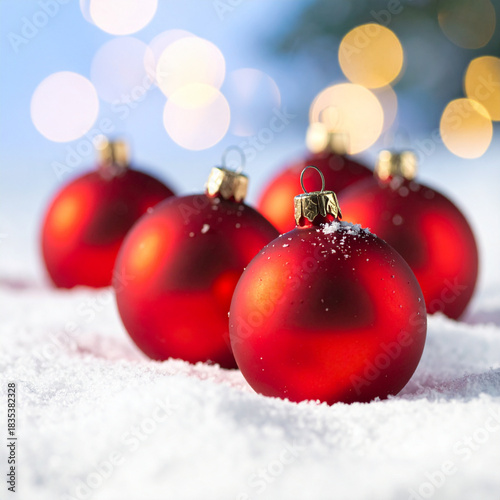 red christmas balls on snow