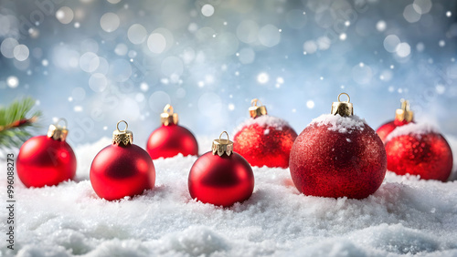 Red Christmas balls sitting on fresh white snow , holiday, decoration, festive, winter, ornaments, seasonal, traditional, snowfall