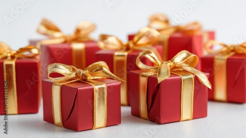 Red christmas gift boxes with shiny gold ribbons and bows stacked on transparent background, festive holiday celebration concept with ample negative space and high-key lighting