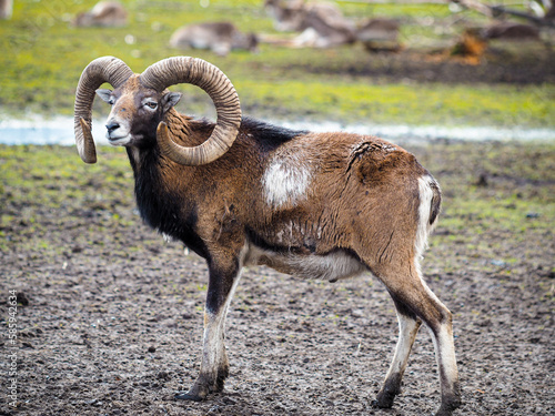 Red deer deer, fallow deer majestically powerful adult animal outside the forest. Mouflons that live with deer. A large animal in the natural forest. The wild landscape creates nature. Deer garden.