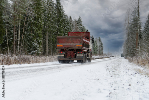 Red Dump Truck Driving on Snowy Rural Road Through Winter Forest