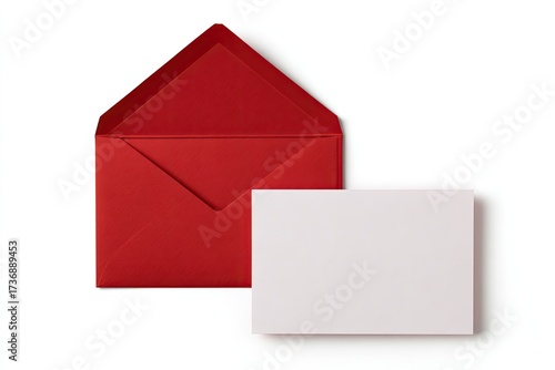 Red envelope partially open with a blank white card beside, on a white background with shadows